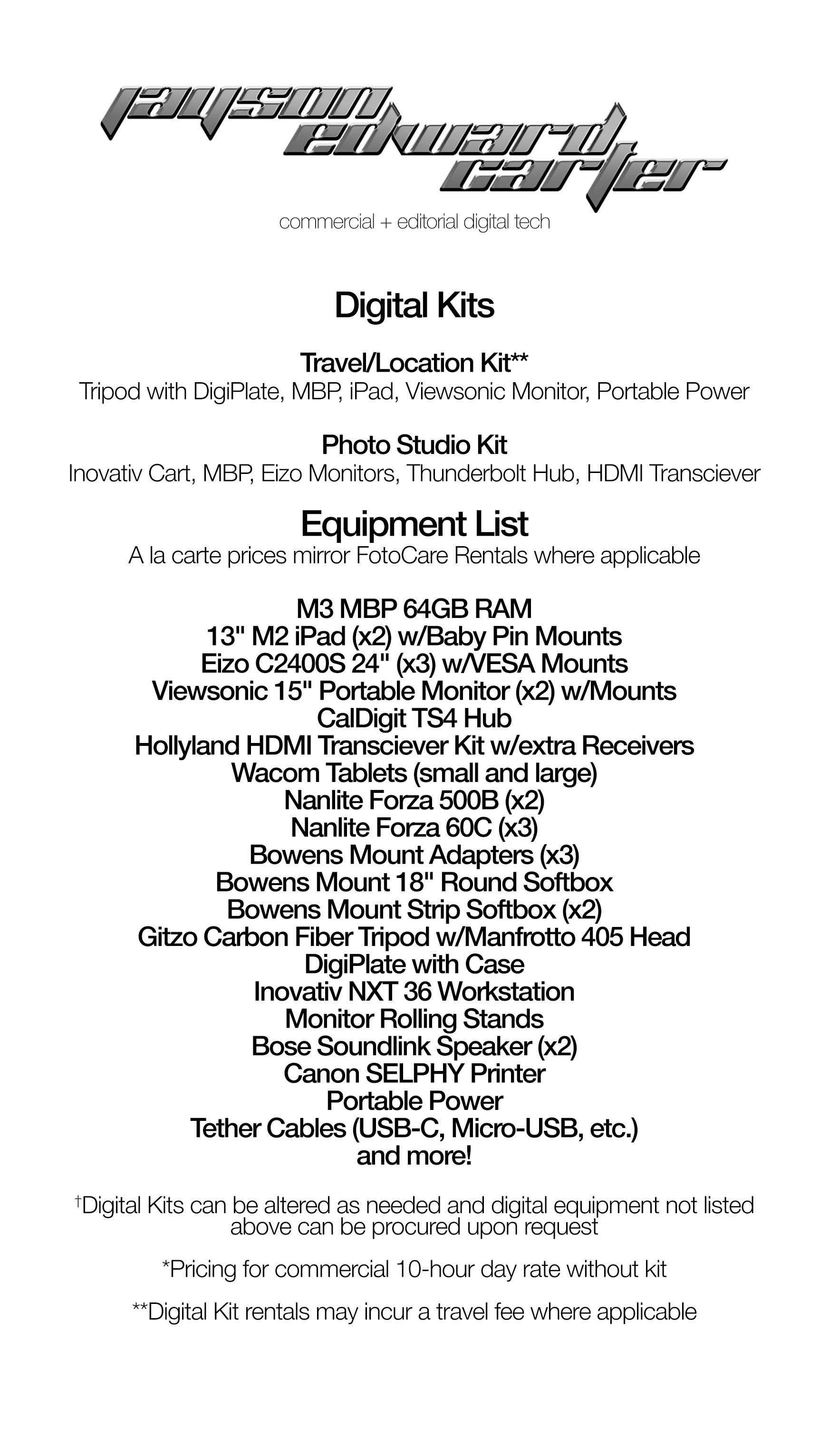 See below for a list of equipment and feel free to reach out to inquire about rental/kit!